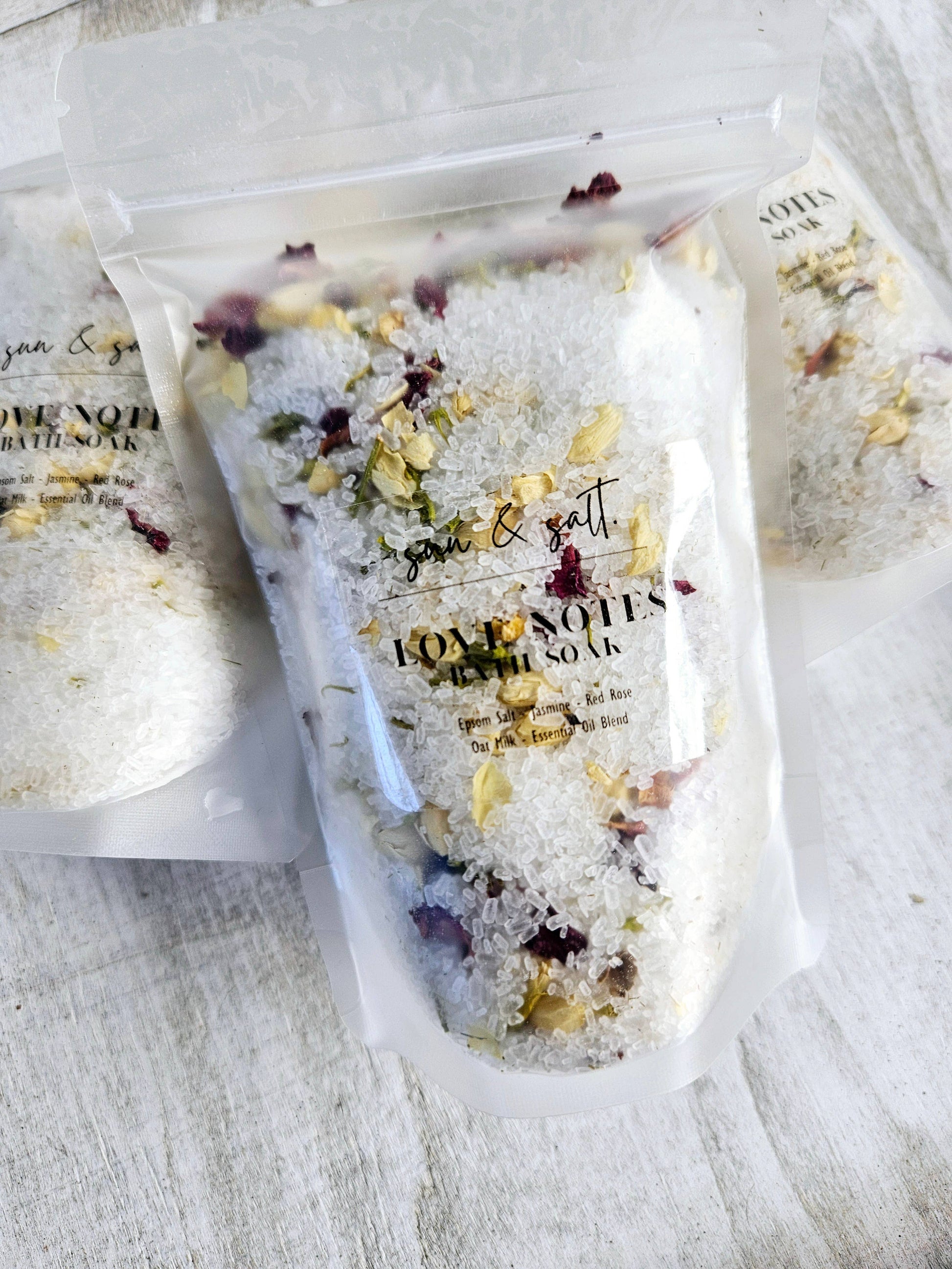 Ingredient List: Epsom Salt - Jasmine Buds - Red Rose - Oat Milk - Essential Oil Blend Handmade; Small Batch. 2-3 Baths per bag. These can be used in a sachet or loose. If used loose- allow tub to completely dry for easier clean-up.